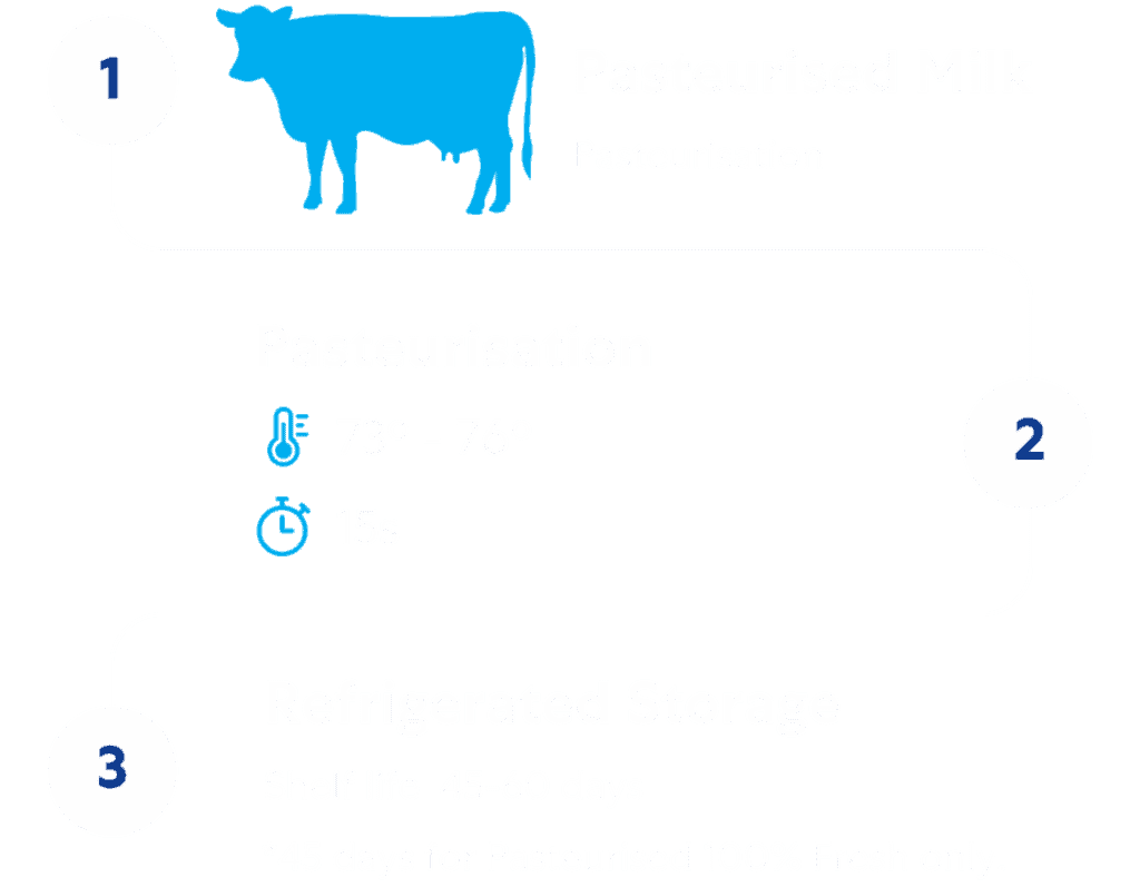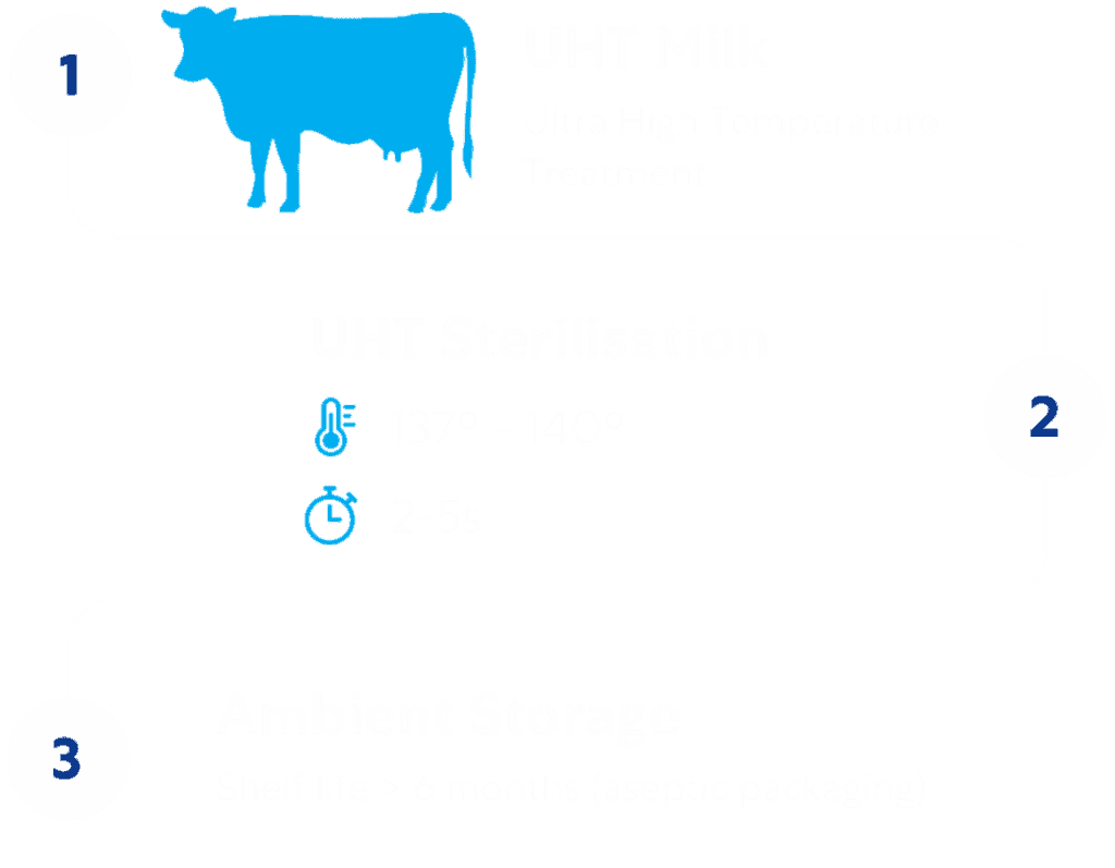 The ultra-heat treatment (UHT) kills all bacteria and packaging technology keeps all milk fresh and stable even when unrefrigerated for up to 6 to 12 months.