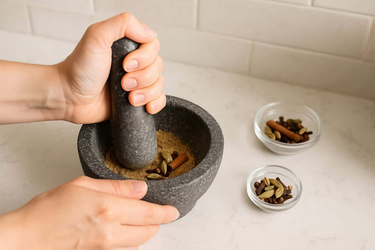 Grind the cardamom, cloves, and cinnamon until it becomes a fine spice mix powder.