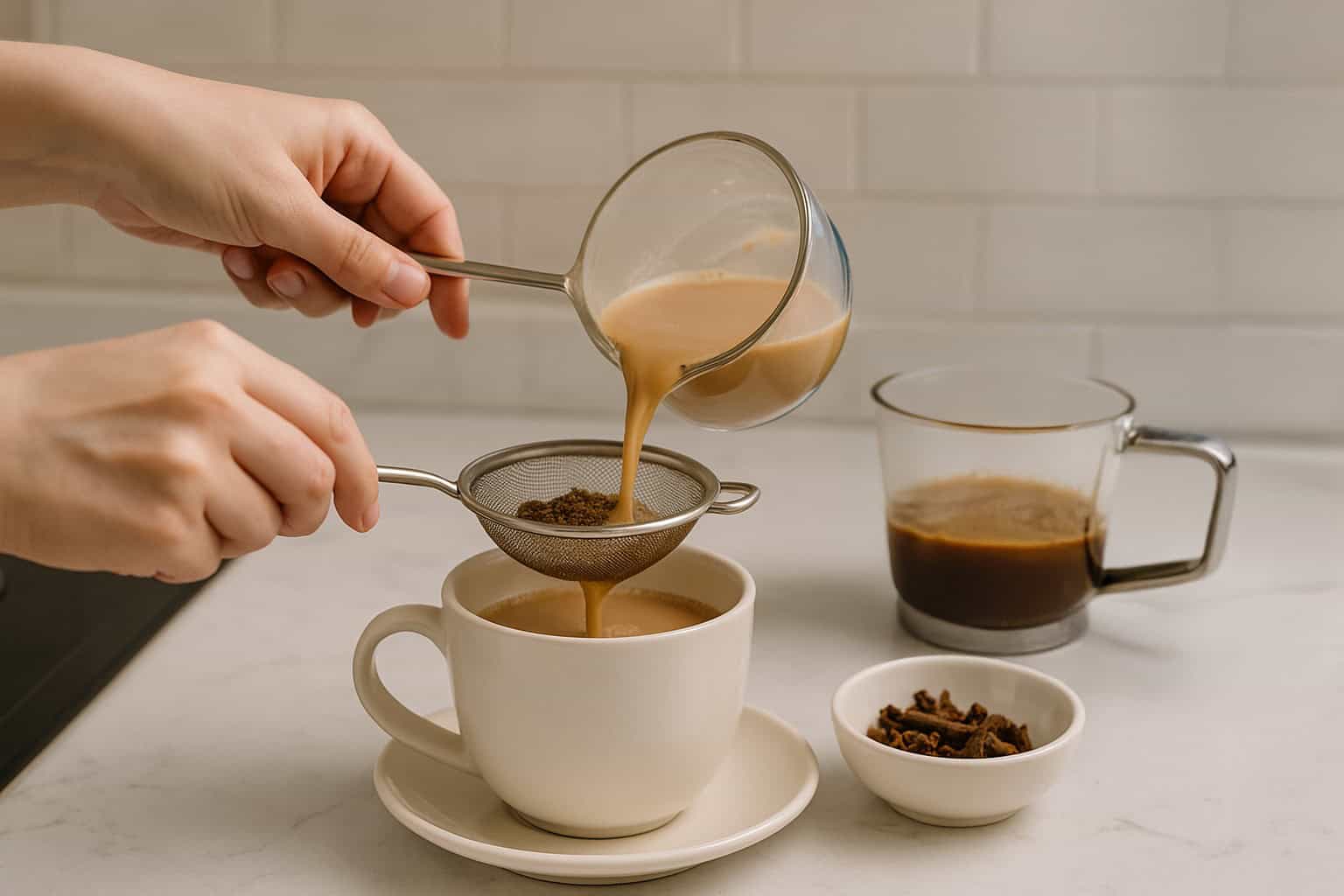 Strain the tea to remove all the leaves and spices and serve in a mug.