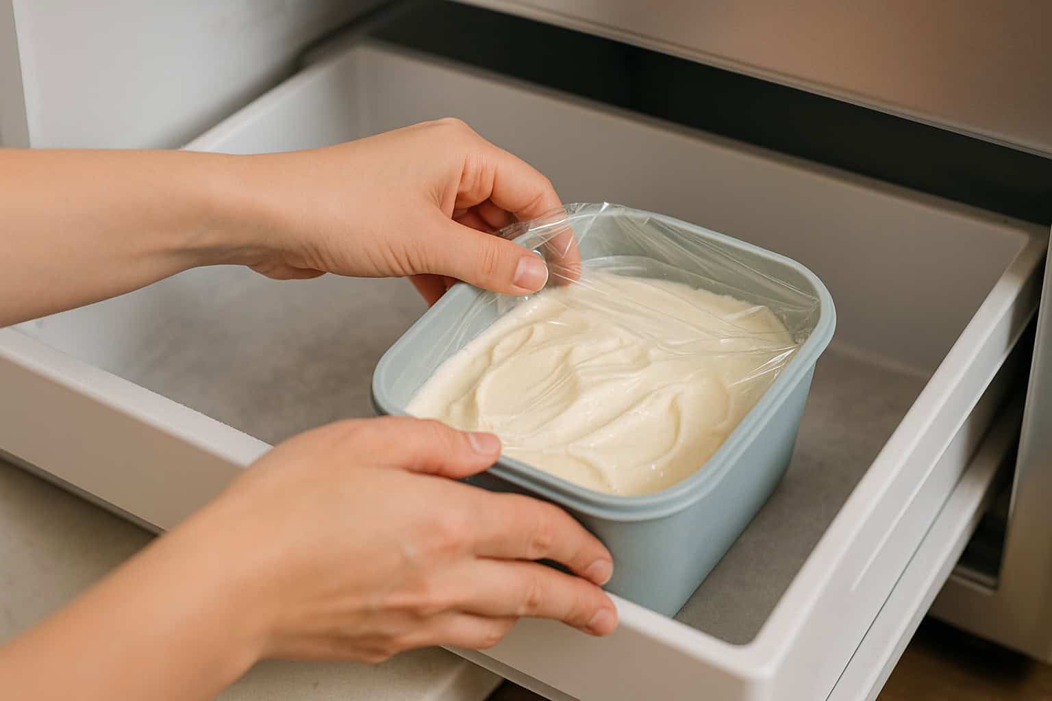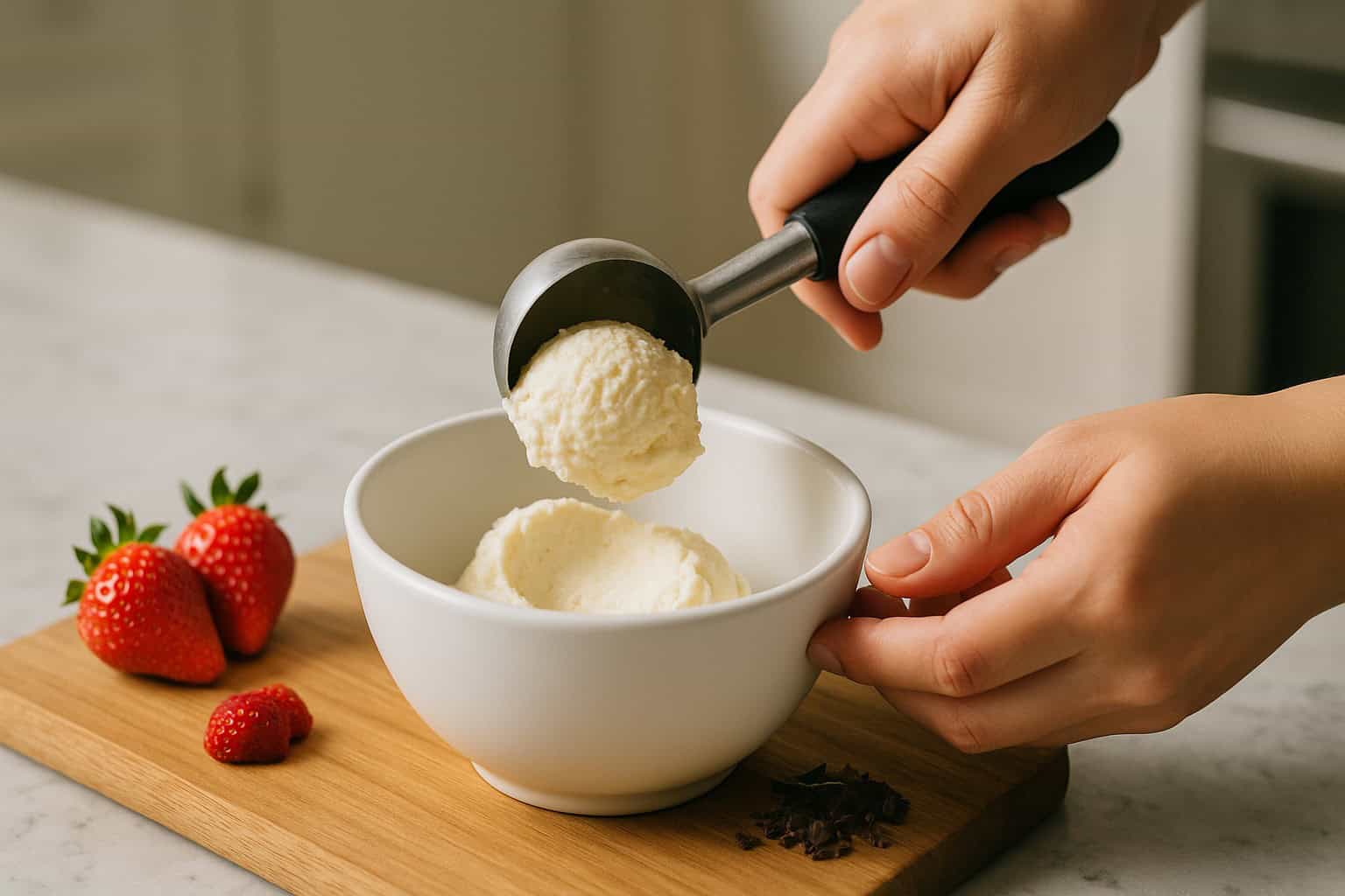 When ice cream is softly frozen, serve immediately or place a piece of plastic wrap directly on the ice cream and place in freezer for 2 to 3 hours.